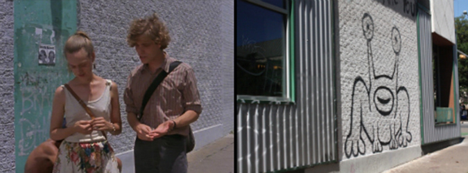 Again, hard question to answer since Slacker isn’t at all narratively linear, and so there are lots of ways to think about this. One is that movement and passage of time propels the action. Each of the vignettes we wander into is dynamic, and this agitation is often what draws us out of one situation and into another. As the day passes, we have an opportunity to move into different kinds of spaces and situations – from coffee shops in the morning to midday matinees, dimly lit nighttime bars, and early morning walks of shame.