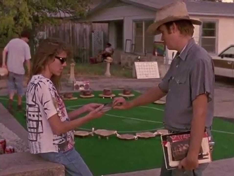 Another possibility is that the conundrum of existence – of consciousness – is what is on the other side of the action of Slacker. It’s hard not to ask yourself the question “What are all these people doing?”… they strive (or not), talk, walk around, experience things, drink beer, drive around, play made-up games, buy newspapers, spout conspiracy theories, and on and on and on. But what is all this for? Why are all these people here? What is the point of all this aliveness? Some of our subjects attempt to examine the nature of their realities while many focus on minutiae contained within, but an argument can be made that they’re all working on solving the same equation/mystery whether or not they know it.