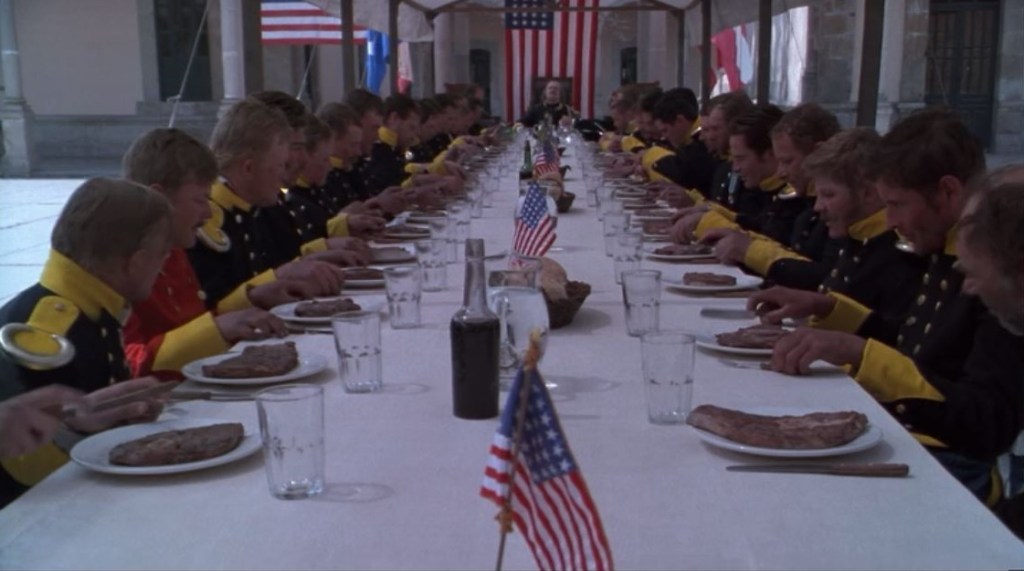 Though the conflict between the two main characters is strong, the fascinating strangeness of the film is so much bigger than strong performances from its lead actors. As a whole, the movie feels like an accidental combination of very distinct but unrelated choices, likely thanks to studio mismanagement and creative team drama going on behind the scenes. The result should be disastrous or sloppy or incoherent––but miraculously, it works. The whole that these disparate parts create is cohesive and tight. For example, the film’s prologue––which quotes Nietzsche and “Eat me,” or the memorable first scene in which dozens of soldiers chow down on bloody steaks––blends the production value of a Hollywood historical drama with a dissociative mix of sound and visuals, similar to what you might find in an experimental or avant-garde film.