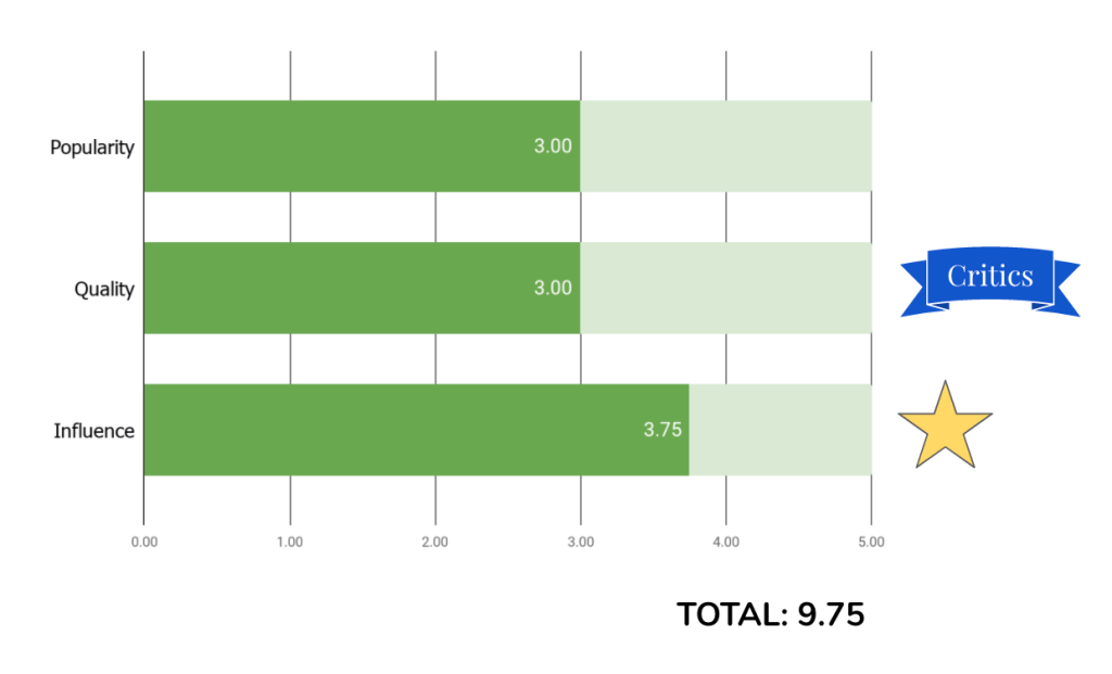 - Influence – 1) Moneymaker: the amount of money a film made in profit relative to its budget, 2) Cultural Infiltration: the extent to which a film has permeated film/media culture (i.e. how often it is referenced in other works, whether it inspired sequels/remakes, etc.), and 3) Cinematic Significance: a filmβs prestige and/or lasting legacy (awards won, prestigious filmmaker, canonized by Criterion, etc.)