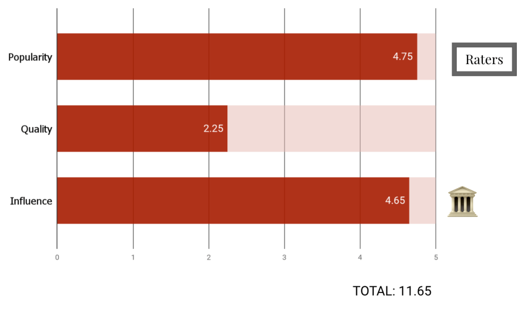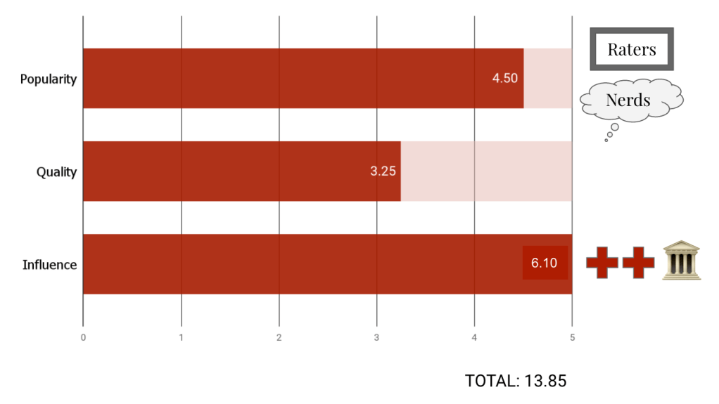 - Influence – 1) Cultural Canon: how often the work is referenced in other works or inspired sequels/remakes; 2) Awards; 3) Prestige: Accomplished Director or strong film Festival presence; 4) Cult Status: enthusiastic online community; 5) Icon: mentions in “best of” lists