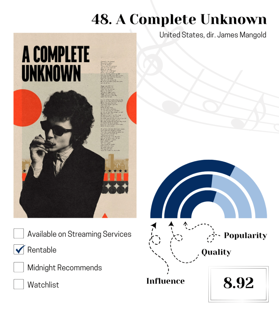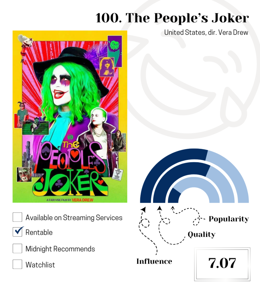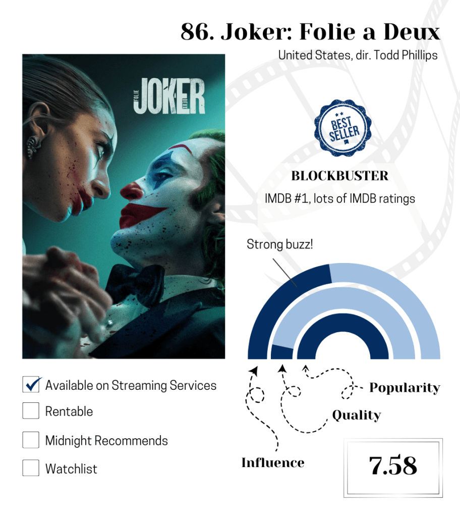 Check out that quality rating. Oof! Brutal! Todd Phillips’ Joker sequel earns the dubious honor of being the worst film in the top 100. Congratulations?