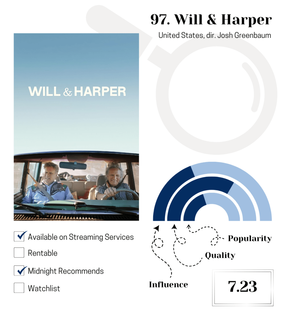 Lovable goof Will Ferrell and his longtime friend (and former head writer for SNL) go on a road trip after her gender transition at age 61. He asks questions, the way friends do, and provides a kind of celebrity cover for her as she does so many things for the first time as her true self. Lots of things about this film struck me deep in my heart – Harper’s everyday kind of courage, the unexpected kindness of strangers, Will’s sometimes-awkwardness as he adjusts to new dynamics between them – but what stood out the most was how strong and resilient friendship is, and how uncompromisingly essential it is to a thriving life. One of the year’s standout heartwarmers! Team Midnight recommended.