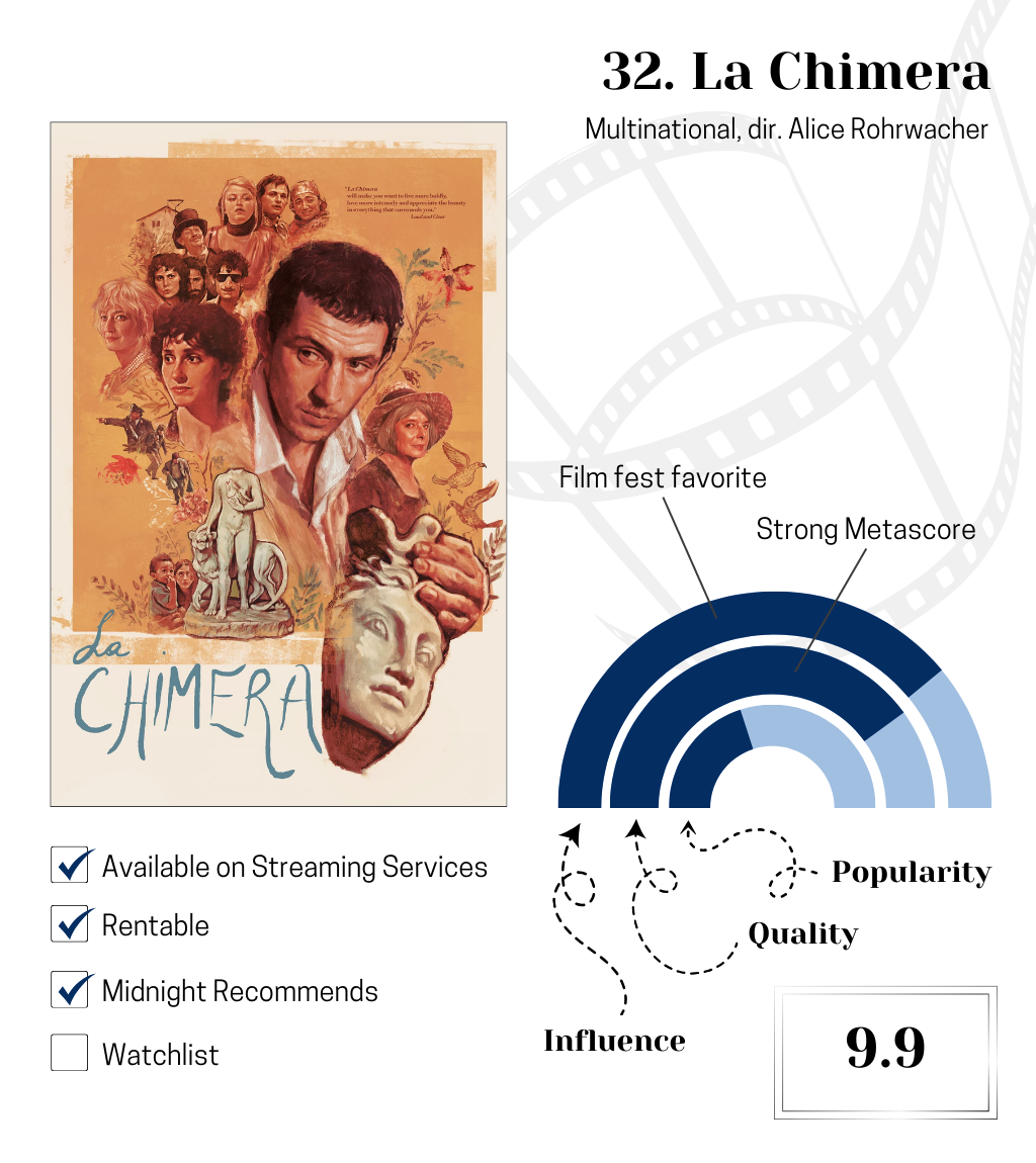 La Chimera is a very special film. Strange and funny, mysterious, romantic, and alive–the film feels both like a crystal-clear remnant of a past now lost to us, and pleasantly dislocated from time. Which is poetic, as the protagonist’s special gift (and curse) is stirring up the past. My favorite breakout actor of last year, Josh O’Connor, plays a persistently haunted, mystically gifted, consistently unscrupulous bandit archeologist in a dirty white linen suit, who disturbs graves long-forgotten in Italy’s countryside and steals their treasures, along with his crew of ridiculous ne’er-do-wells. One of my favorite films of the year, La Chimera casts a spell. Strongly recommended by Team Midnight. Give it a try!