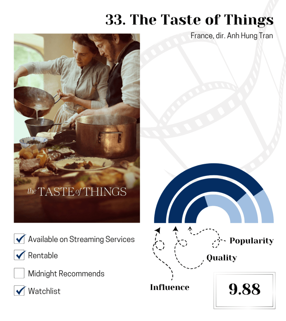 Robert Eggers’ latest just got squeezed out of the top 10, which I find kind of perversely satisfying. I mean, if you’re going to be an overly serious and precise auteur, how do you get away with a REMAKE of one of the most iconic and regularly re-made films of all time while (not only) not addressing, but arguably amplifying the anti-semitism that underlies the whole Dracula mythology!? Get it together, Robert Eggers! Pull your head out of Werner Herzog’s ass.