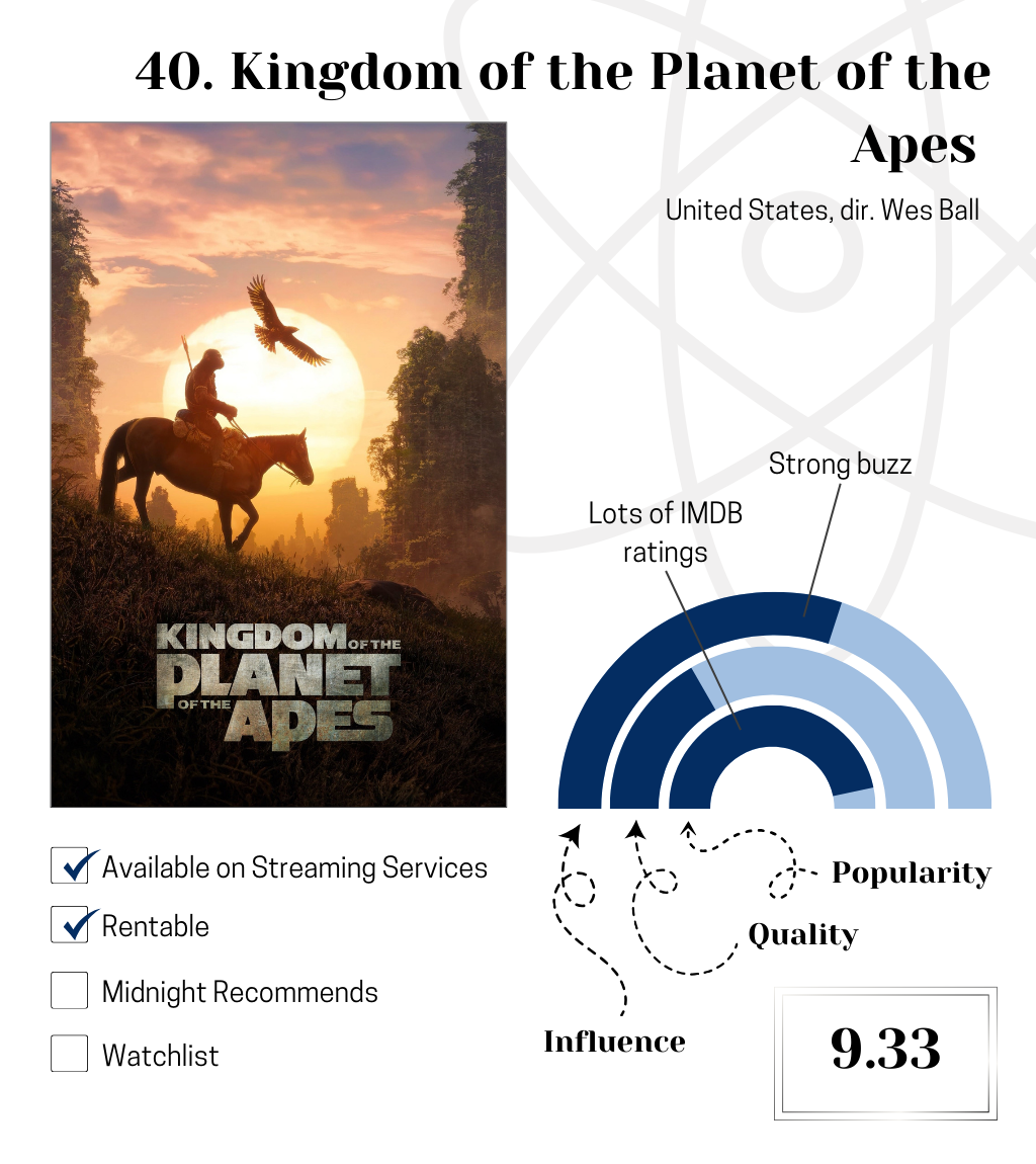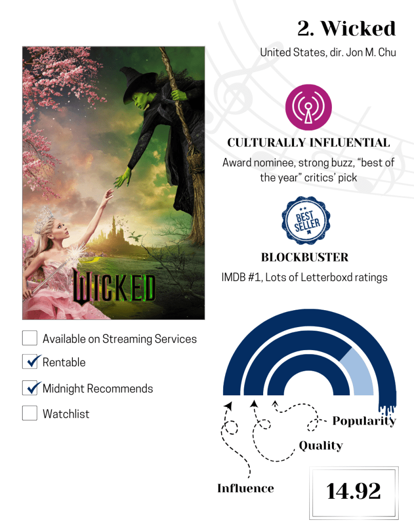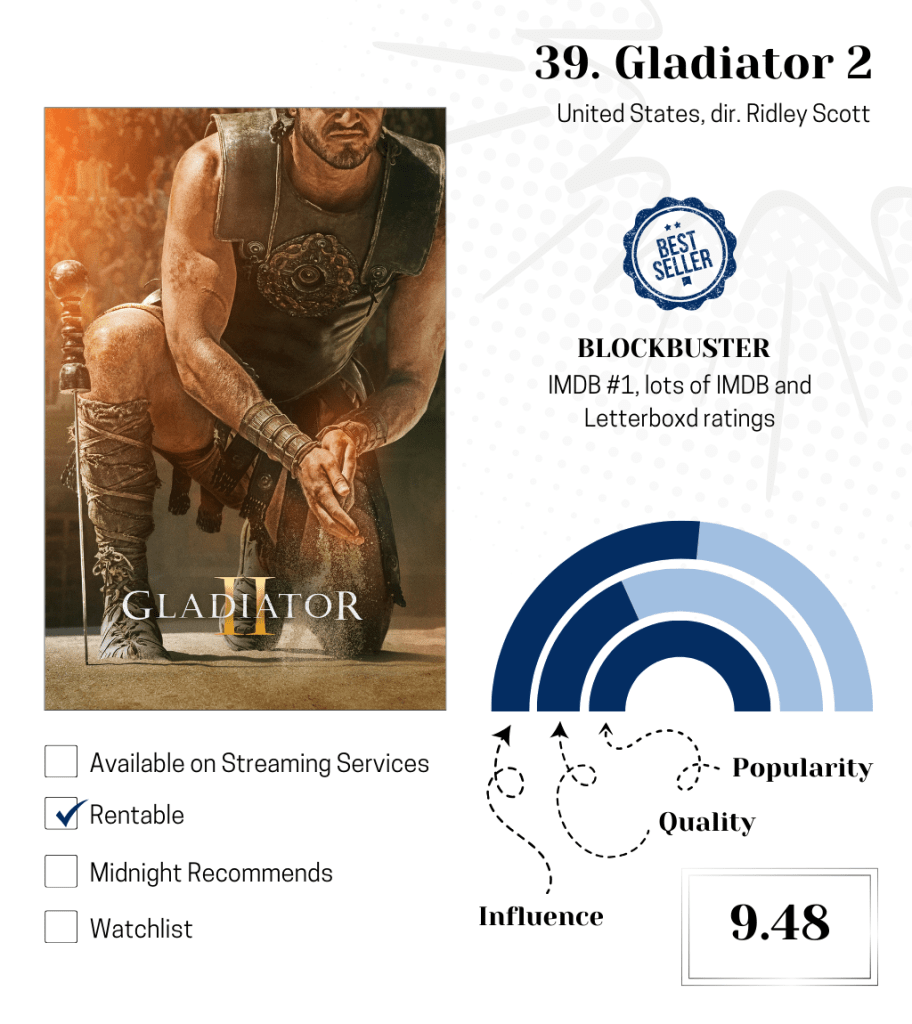 Dune Part Two crushed the 2024 metrics, taking the top spot in multiple metrics in every category – a feat not accomplished by any film since I’ve been doing this. Overflowing with star power (Chalamet and Zendaya are both at the top of their game), the best visuals and sound design available (in technology, craft, and artistry), grown from the vision of one of our generation’s most impactful big-budget auteurs – and all that money and mastery stacked on what is arguably the best sci-fi novel in existence.